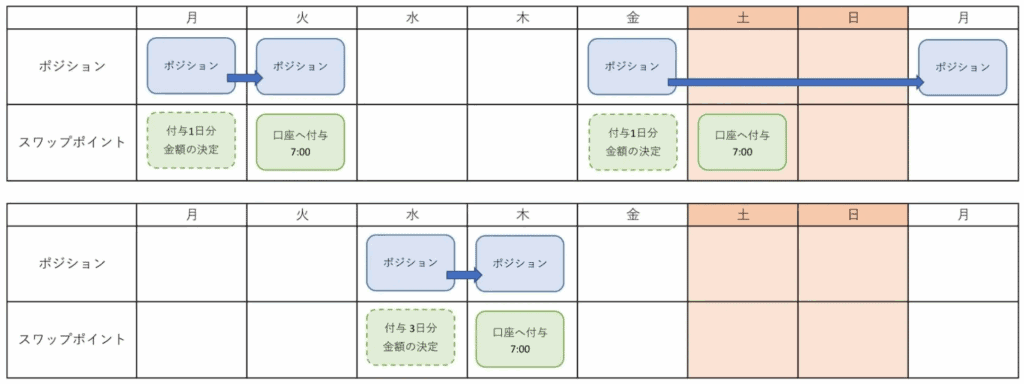 なお、土日は為替市場が休場のため、週末分のスワップポイントは水曜日にまとめて計算されます。